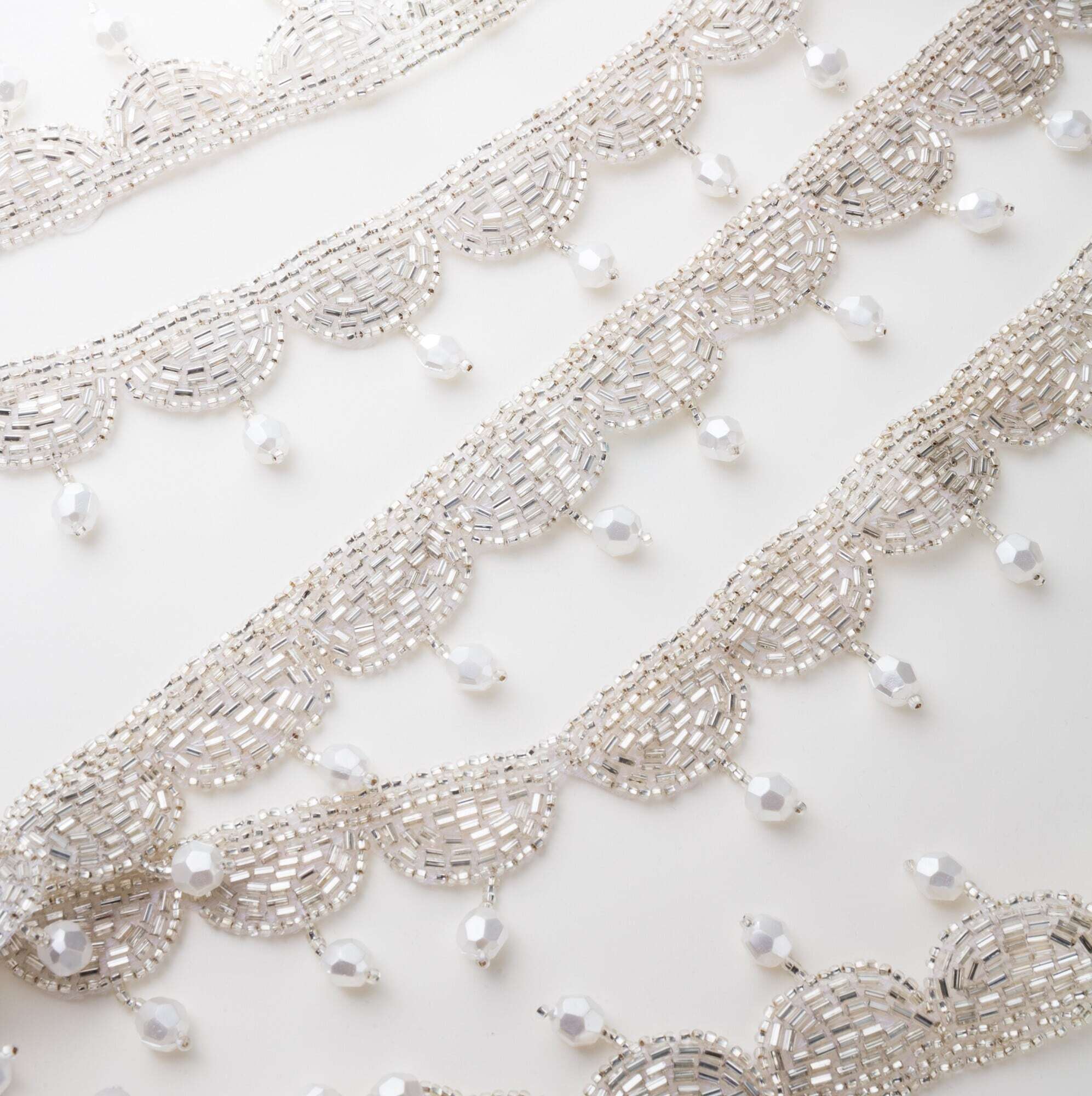 シルバービーズを幾重にも重ねた、スカラップデザインのブレード。