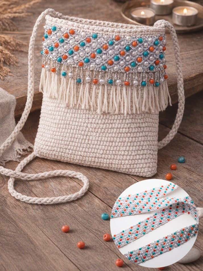 【カジュアル系】このブレードの持つ明るく楽しい雰囲気は、カジュアルなアイテムとの相性も抜群です。シンプルな無地のTシャツの首元や袖口に縫い付けたり、デニムジャケットのポケットを縁取ったり、キャンバス地のトートバッグをデコレーションするのに最適です。いつものカジュアルウェアに、個性と遊び心を加えることができます。