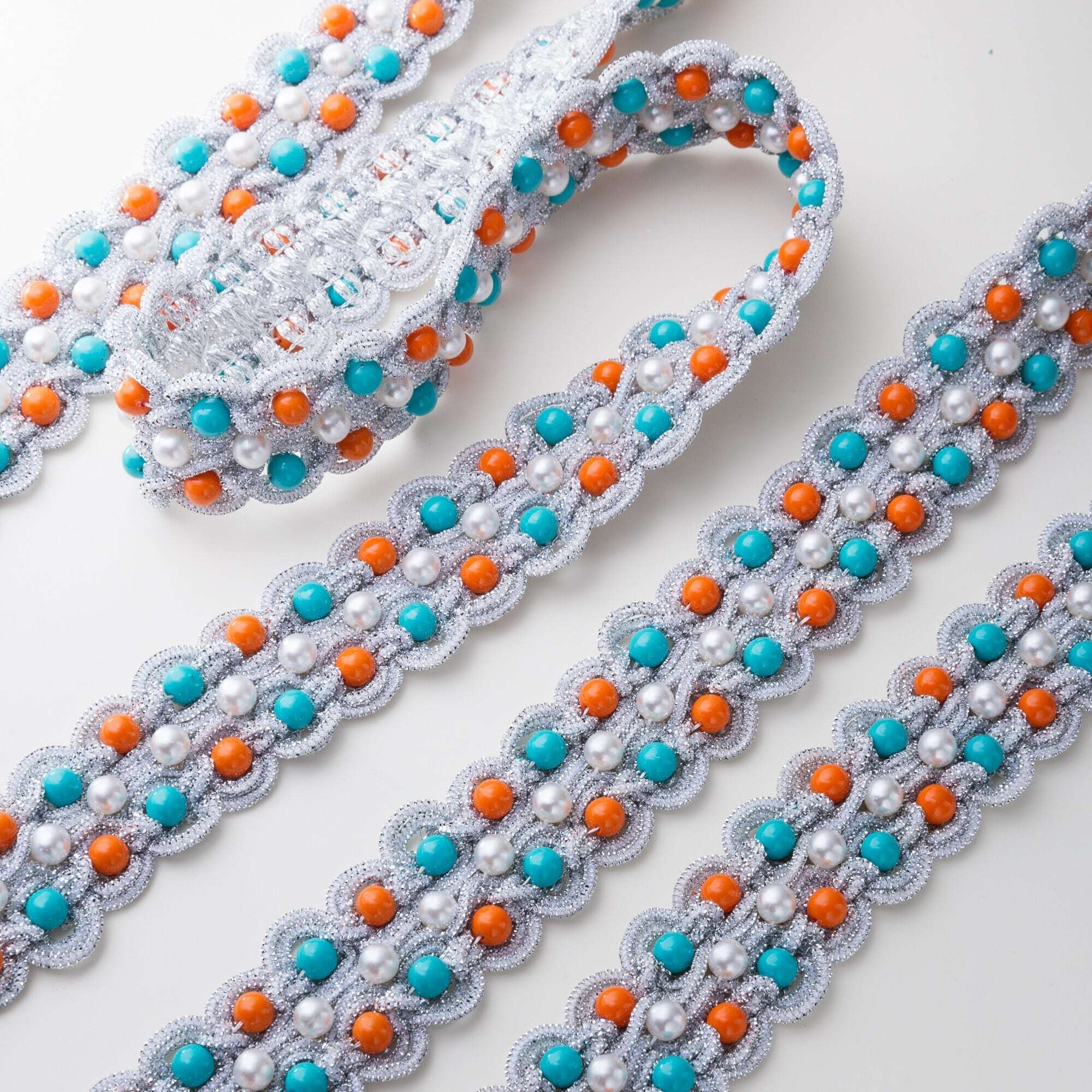 シルバーコードのブレードにターコイズブルー・オレンジ・パール調ビーズをあしらった華やかなデザイン。