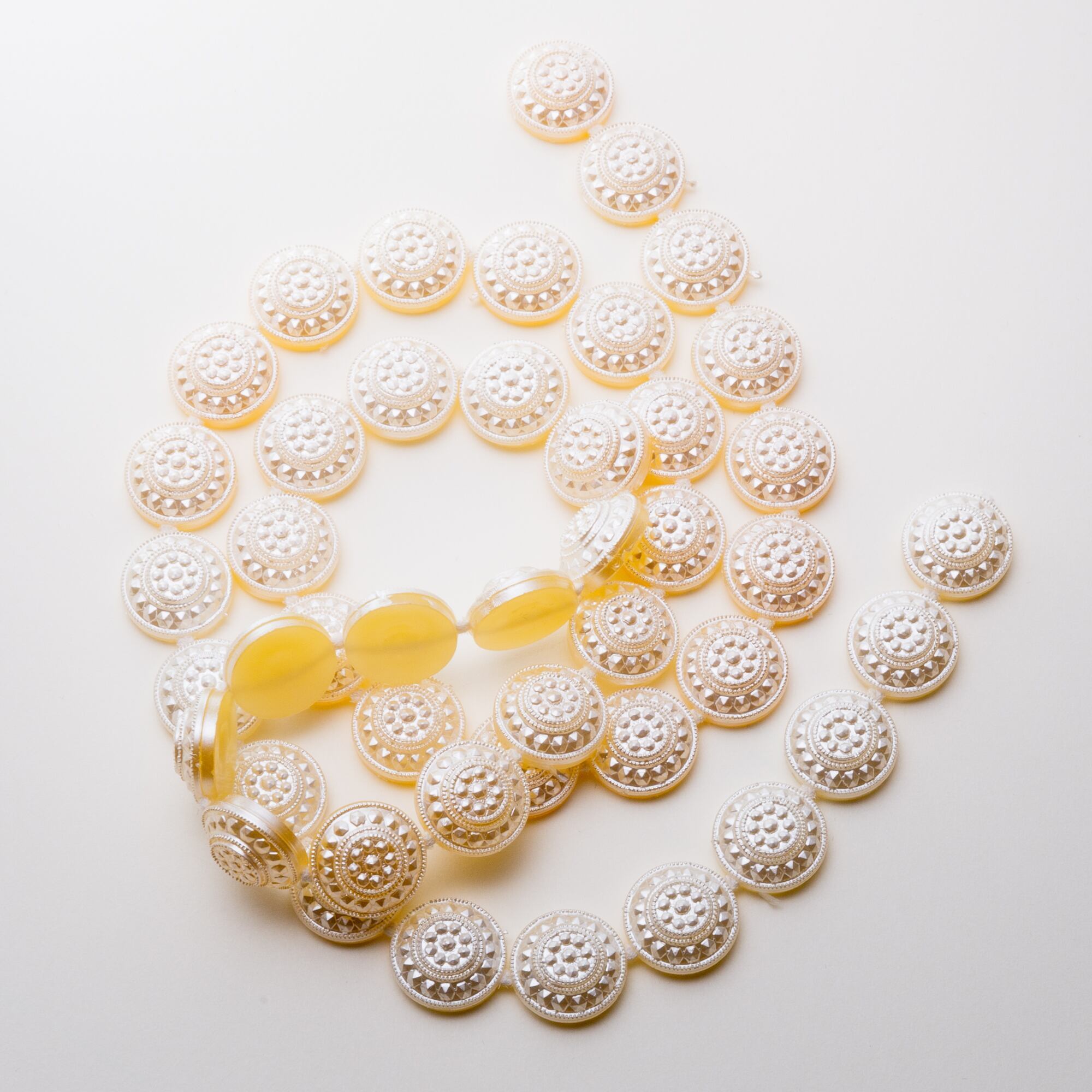 ぷっくり丸いカボションボタンのようなモチーフが並んだ、アイボリーホワイトのブレードです。