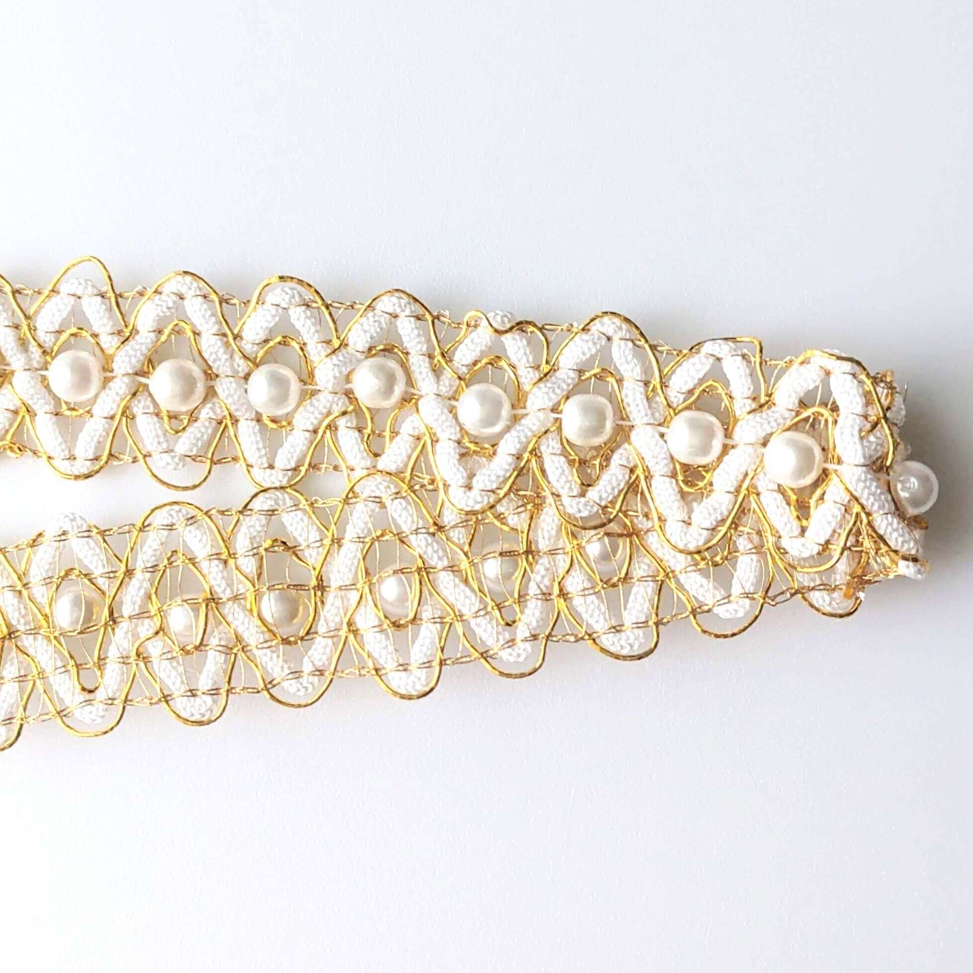 白いパールビーズをあしらったホワイトコードとゴールドコードがきらめくフランス製ブレードです。