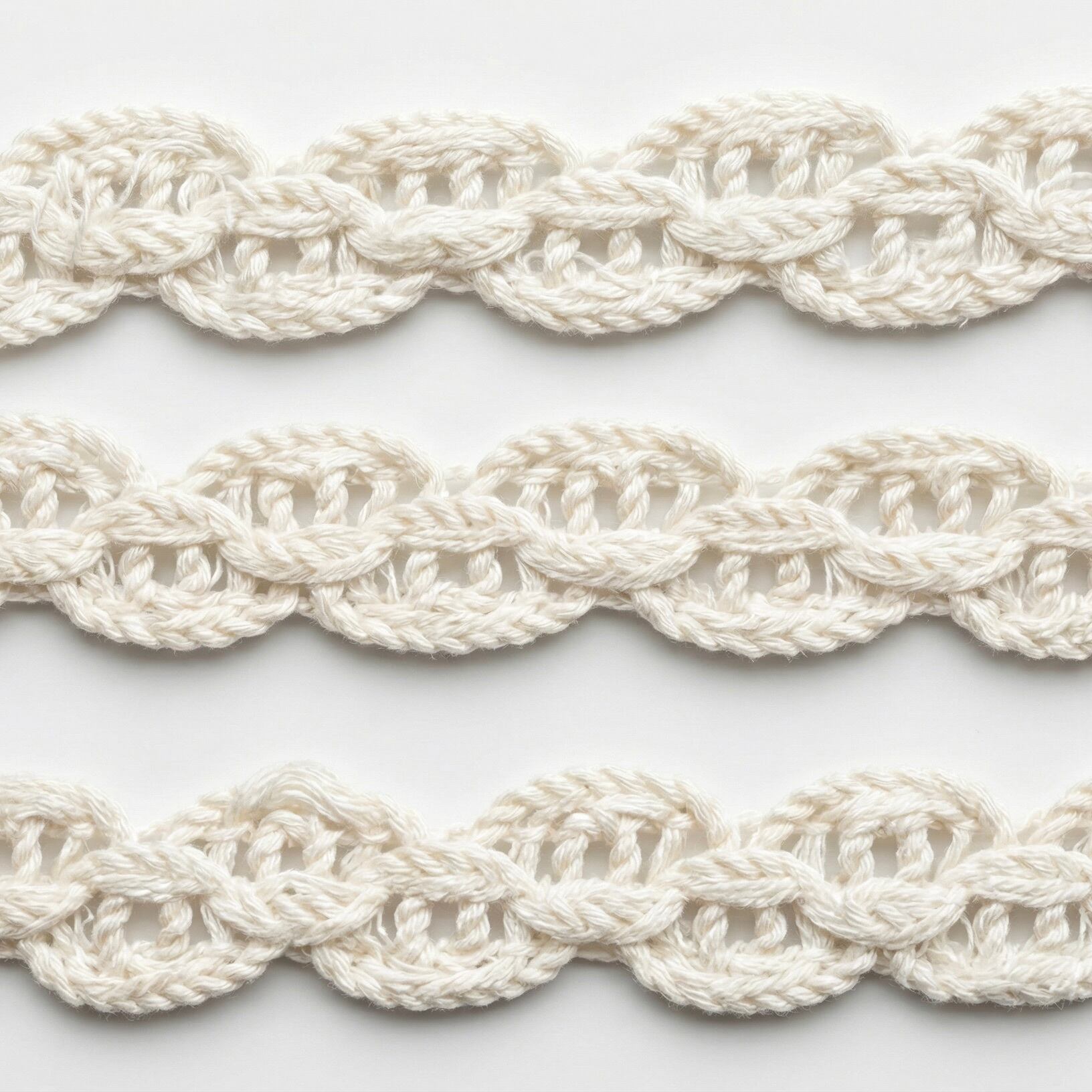 上質なシルク糸を使い、かぎ針編みのように丁寧に編み上げられたブレードです。波打つようなスカラップ状のデザインが連続しており、その編み目には透け感があって非常に軽やかな印象を与えるフランス製ブレードです。