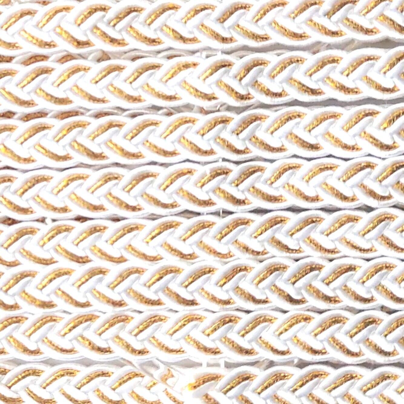清潔感のあるホワイトのコードと、輝きのあるゴールドのコードを丁寧に編み上げた、上品な三つ編み状のフランス製ブレードです。シンプルな構造でありながら、白の持つクリーンな印象と、ゴールドの持つラグジュアリーな輝きが絶妙に融合しています。
