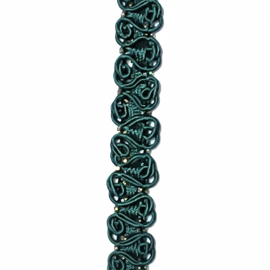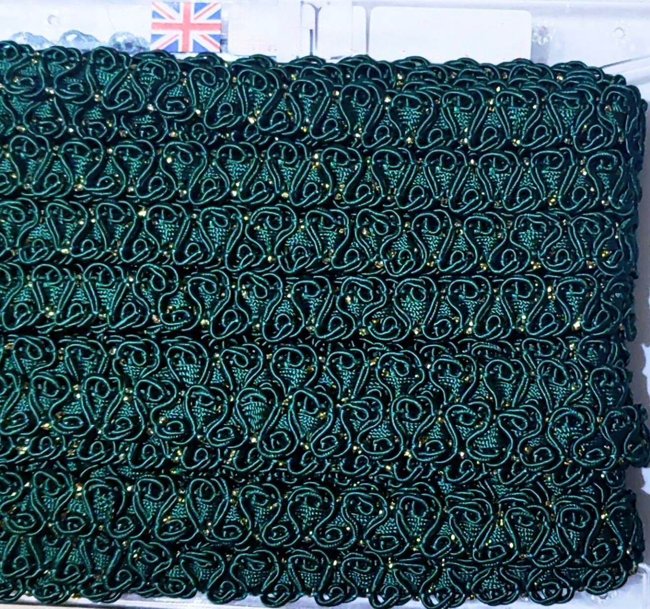 深みのあるフォレストグリーンの光沢がある紐を、一つ一つ丁寧に結び、小さなロゼット(バラの形)のように編み、極小のゴールドビーズが散りばめられている非常に装飾的で繊細なイギリス製のブレードです。